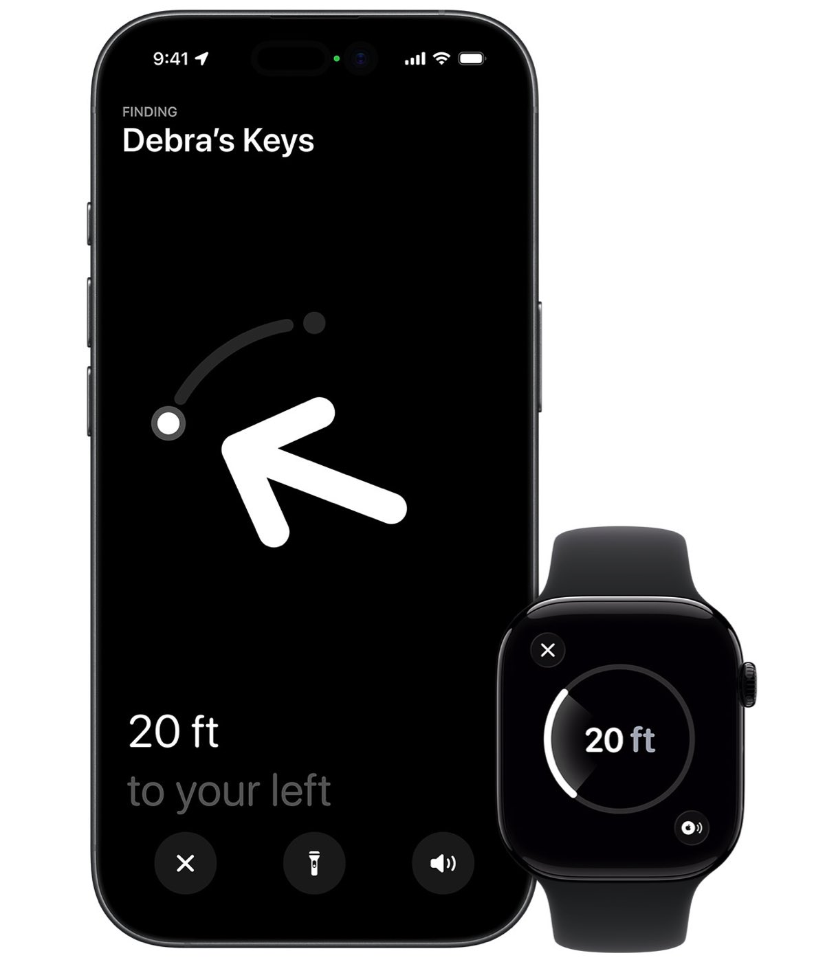 Vergeten waar je je sleutels hebt gelaten? Geen probleem als er een AirTag aan vastzit. Open de Items-tab in de Zoek Mijn-app of vraag Siri om hulp als dat wat je zoekt bij je in de buurt is. En met een 50% luidere speaker kun je AirTag nu van twee keer zo ver horen.