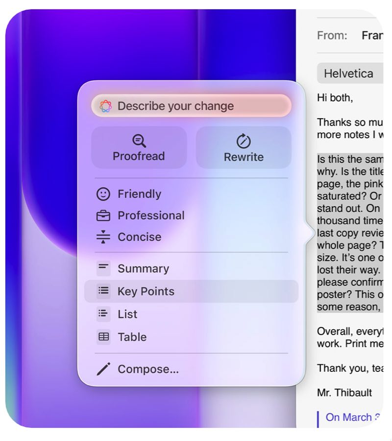 Schrijfhulp. Laat je tekst corrigeren, pas versies aan tot de toon de juiste snaar raakt, en vat geselecteerde tekst snel samen.