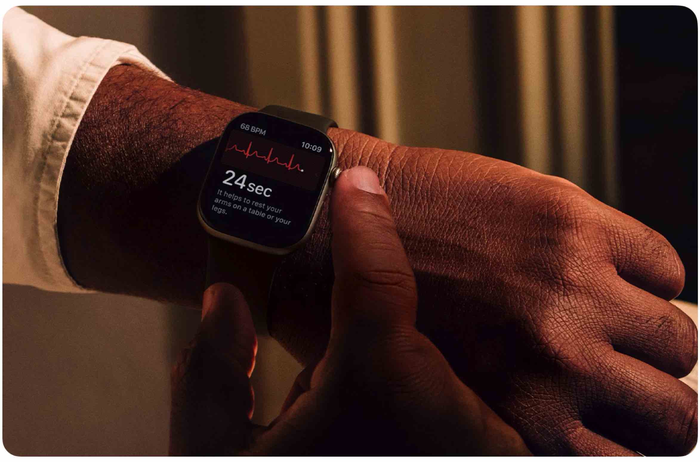 Met Series 11 kun je direct vanaf je pols controleren of je tekenen vertoont van atrium­fibrilleren. Met de Ecg-app kun je heel eenvoudig een elektro­cardiogram maken met één afleiding.