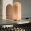 De dimbare Parade tafellamp bestaat uit een vierkante voet en een gewelfde bovenkant van gekleurd glas. Door de geometrische vorm verandert de uitdrukking afhankelijk van de hoek waarin de lamp wordt gedraaid.