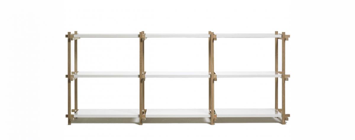 Woody, een elegant stapelrek van de Deense designfabrikant Hay, combineert houten natuurelementen met legplanken in wit staal voor een buitengewoon zen-effect. Verkrijgbaar in diverse groottes en dus ook ideaal als scheiding in een ruimte.