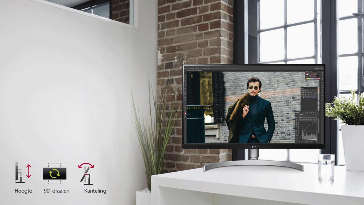 De monitor kan in hoogte worden versteld, kantelen en 90° draaien. Handig voor programma's die verticaal geörienteerde inhoud kunnen weergeven of voor fotografische bewerkingen.