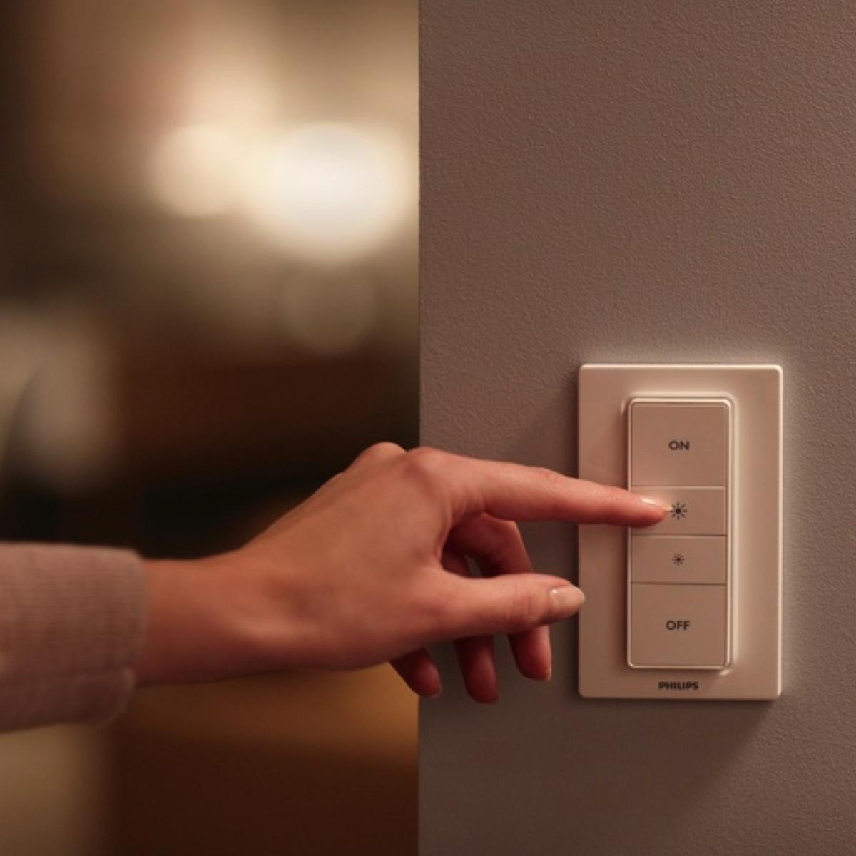 Met de Philips Hue dimschakelaar bedien je je Hue lampen in huis vanop afstand en verhoog of verlaag je de lichtsterkte. Je kan de schakelaar aan de muur bevestigen of simpelweg uit zijn wandplaat halen en als afstandsbediening gebruiken.