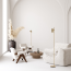 De vloerlamp is verkrijgbaar in geborsteld messing, brons, zwart en wit.Er is steeds de keuze in lichtbron: